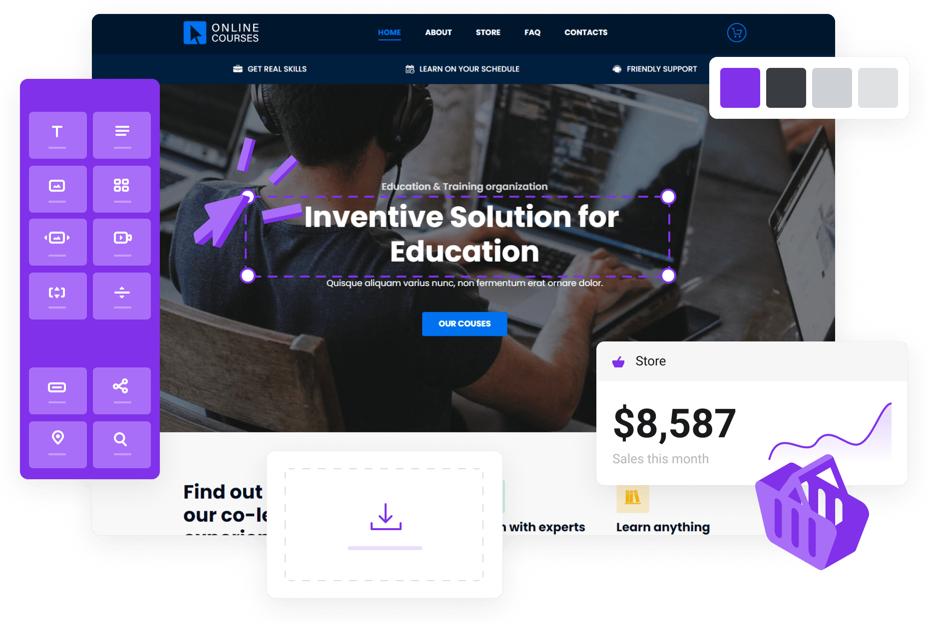 You can use ready-made layout elements like text, buttons, photos, or icons to build any custom professional website layout.